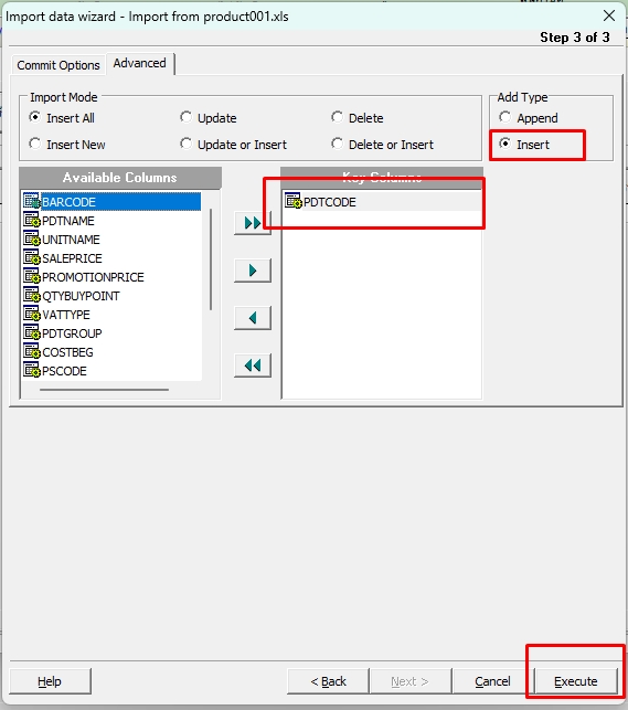 เลือก Insert All ด้านบน หลังจากนั้นคลิ๊กที่ PDTCODE ในช่อง Available Columns แล้วกดปุ่มที่ 2 เพื่อย้าย PDTCODE ไปอยู่ในช่อง Key Columns หลังจากนั้นกดปุ่ม Execute จะมีหน้าต่างขึ้นมาแสดงข้อความว่าเรียบร้อยแล้ว ให้ปิดฟอร์ม ดังรูป